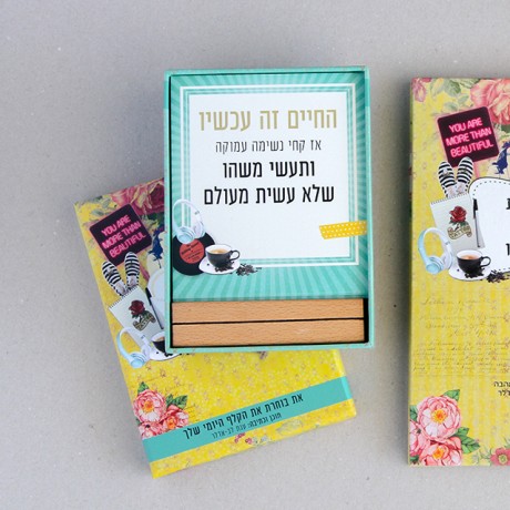 ⇐ חנות קלפי ההשראה שלך "החיים זה עכשיו" → → הקודם: הולכת אל השקט קלפי השראה ← הבא: קלפי ההשראה שלך "החיים זה עכשיו" קלפי השראה חדשים מבית היוצר של ענת לב אדלר קלפי ההשראה שלך "החיים זה עכשיו" המארז כולל 20 קלפים ותושבת עץ(18 קלפים עם משפטי השראה של ענת לב אדלר 2 קלפים ריקים למילוי עצמי). מידות המארז 15X11.5 ס"מ עובי 3 ס"מ ₪60.00 ₪55.00 יח' עוד אחד פחות אחד הוספה לסל « הקודם: הולכת אל השקט קלפי השראה הבא: קלפי ההשראה שלך "החיים זה עכשיו" »